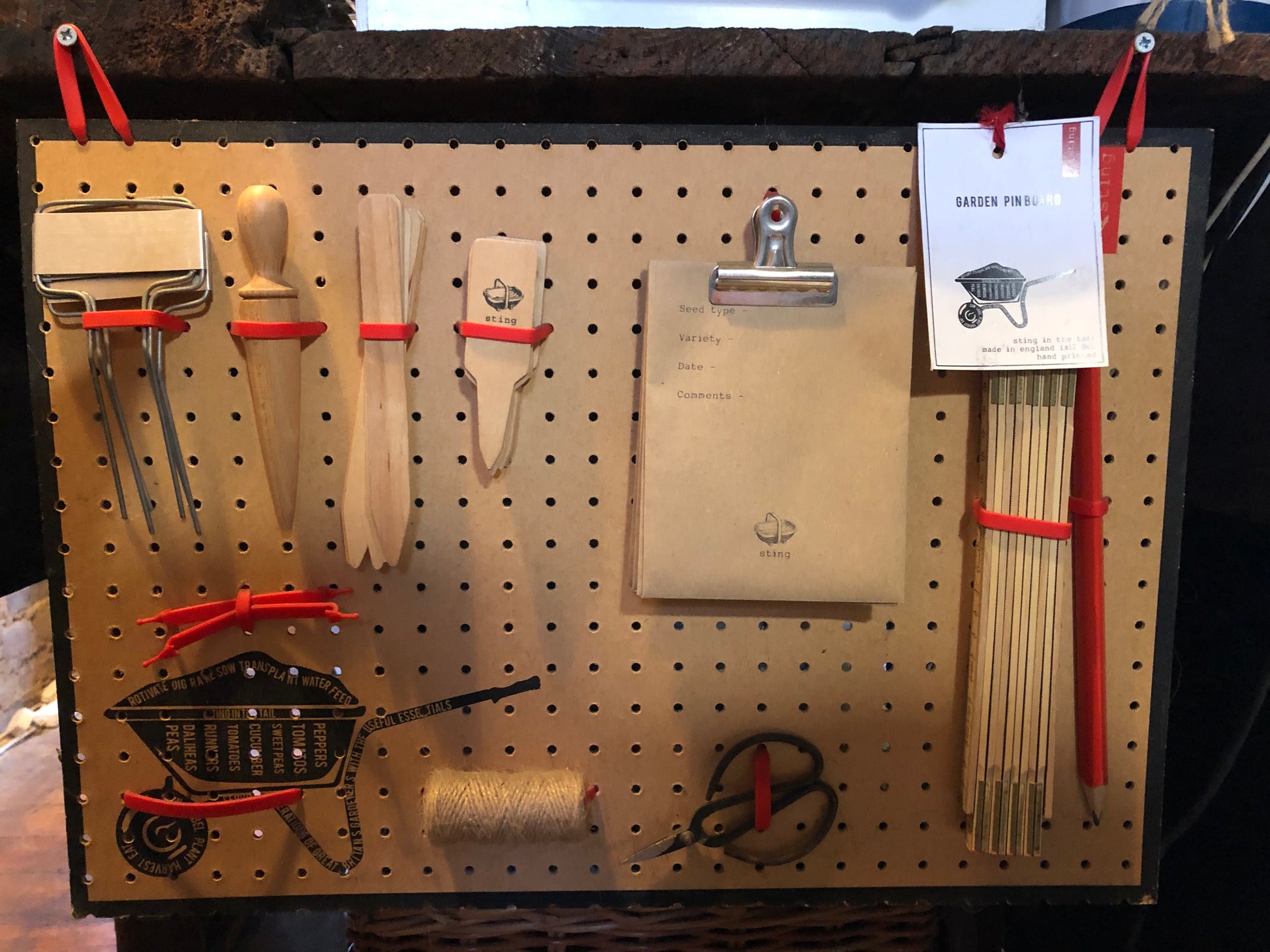 The organiser includes 3 metal plant label holders, 8 wooden plant labels, 10 wooden stakes, wooden plant dibber, roll of natural twine, snips, a builders pencil, foldable wooden ruler, 5 Kraft seed packets held by a bulldog clip, all attached to a useful handprinted pinboard with 9 silicone clips with 4 spare to add your own tools to the board.