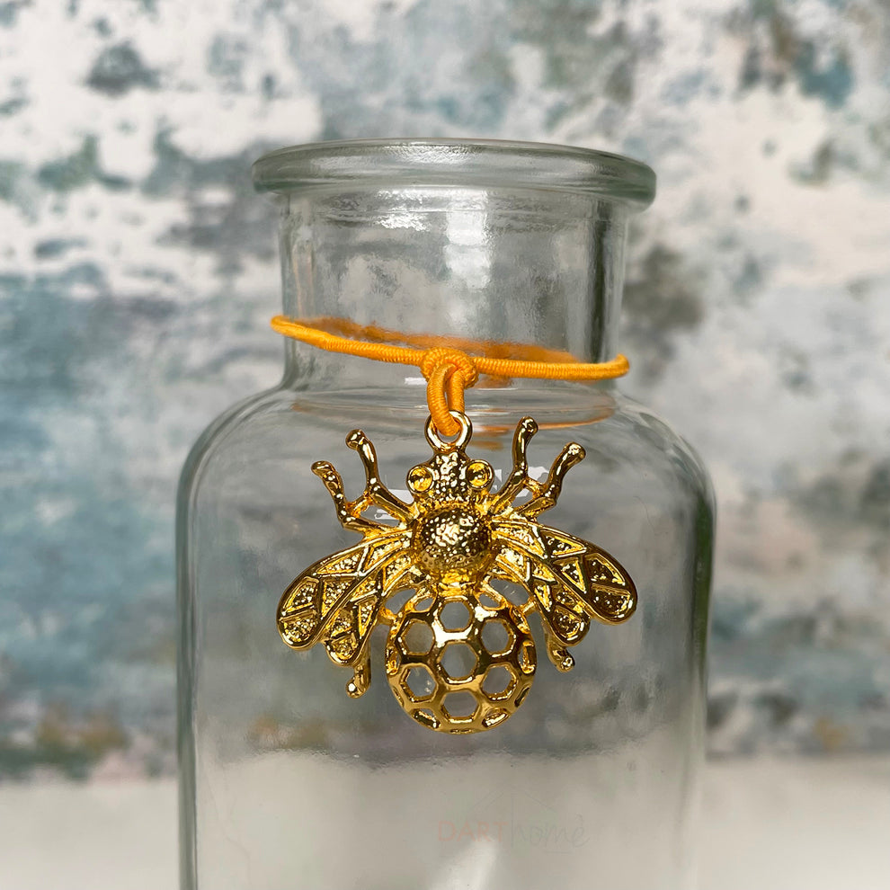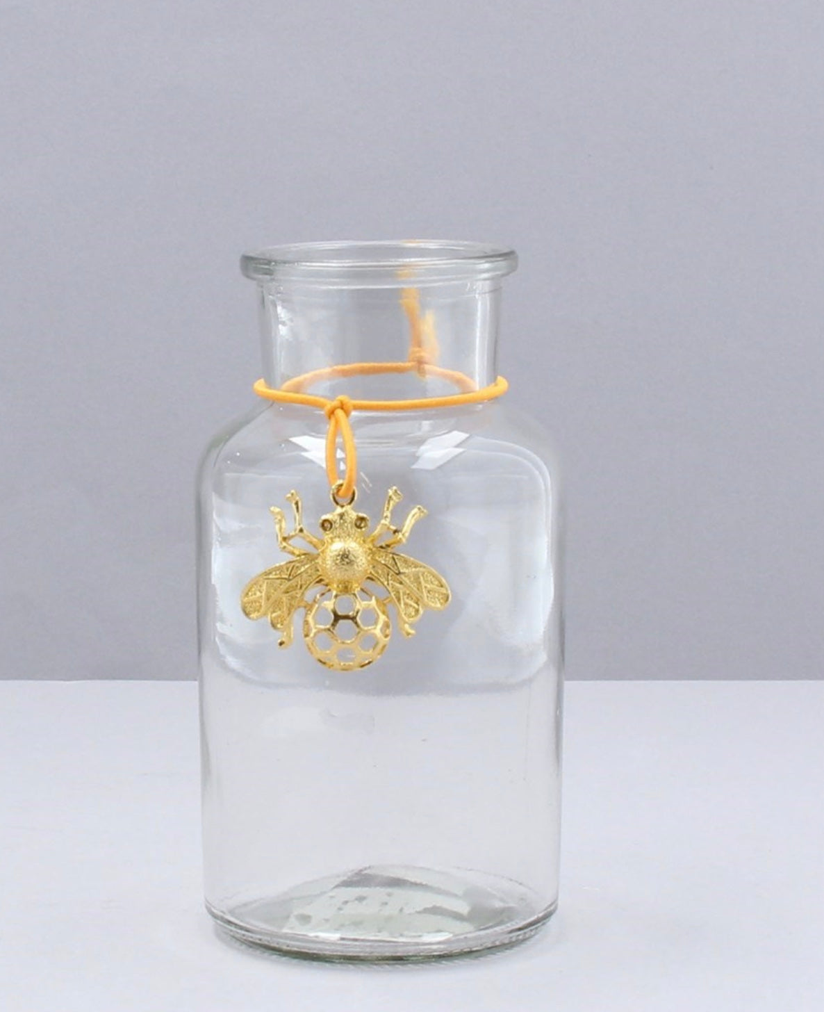 A simple yet elegant mini bottle vase from hand blown glass and finished with a stunning gold honey bee metal pendant. Perfect for displaying your favourite fresh, dried or faux flower buds, to create a beautiful colour filled floral display on your mantle or table top.