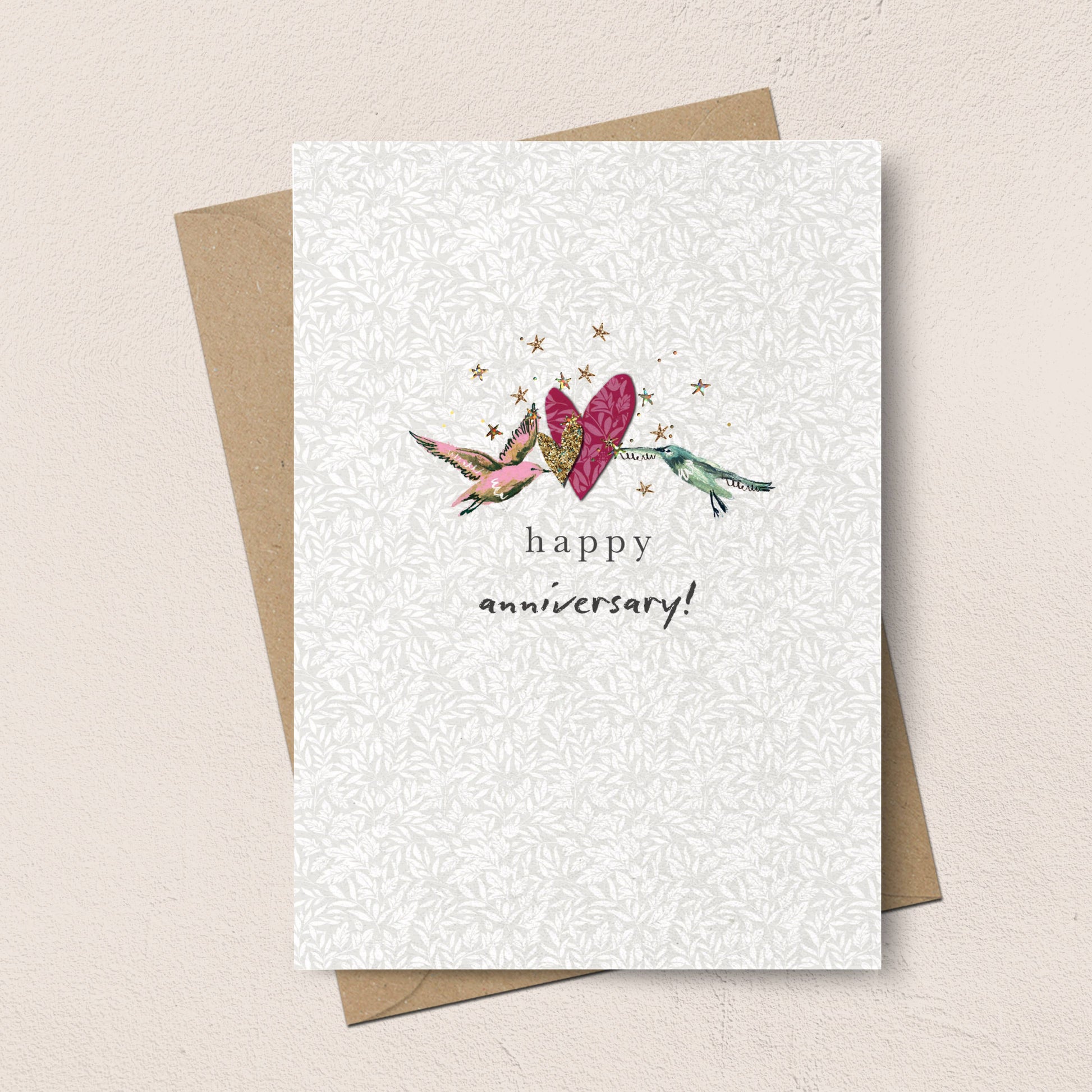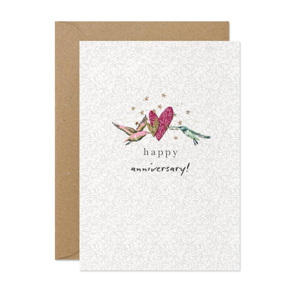 From Stephanie Davies the 'Iconic' collection, this greetings card features flying birds carrying a heart with the caption ‘Happy Anniversary!’. Hand stamped with eco-friendly foil.