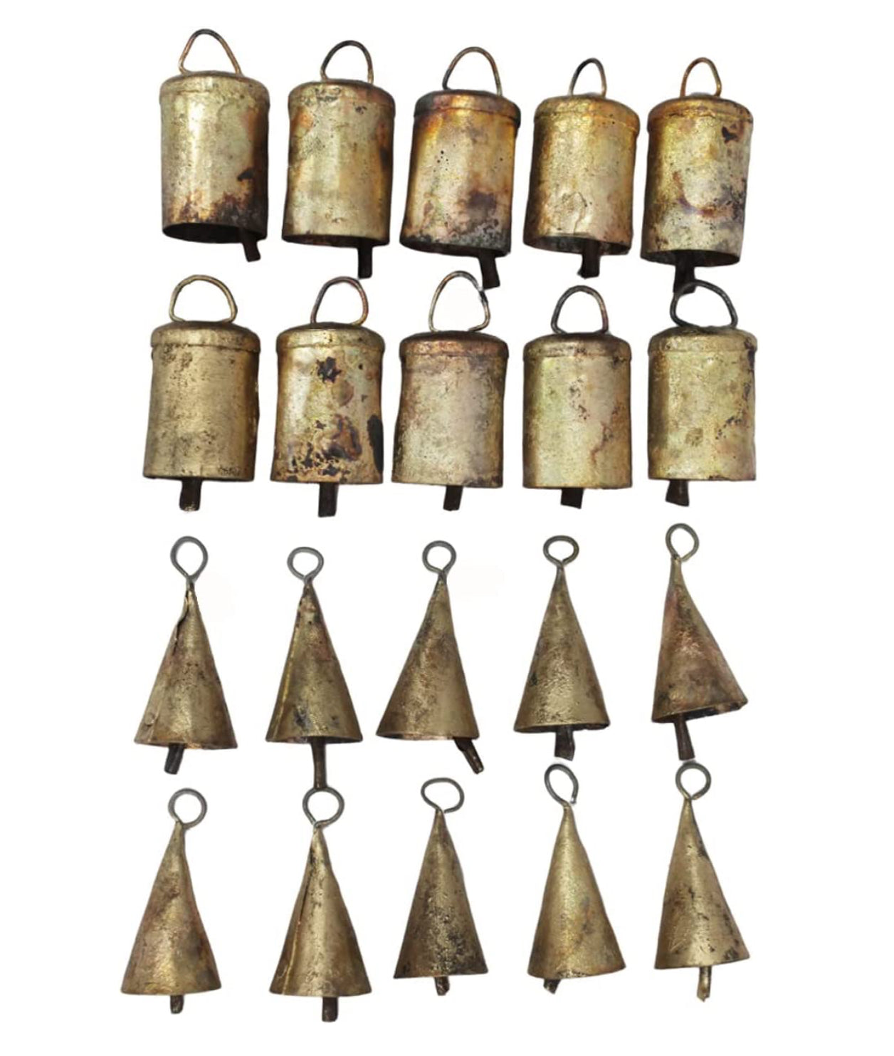 These cowbells have been purposely given a very rough look. Each bell has been individually handmade, hence small variations are possible. The cow bells are then painted with golden color to give it an antique finsih look