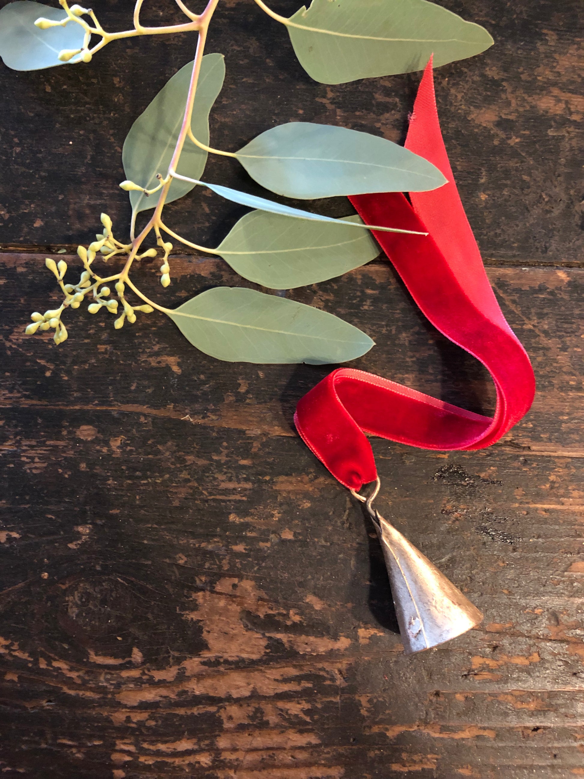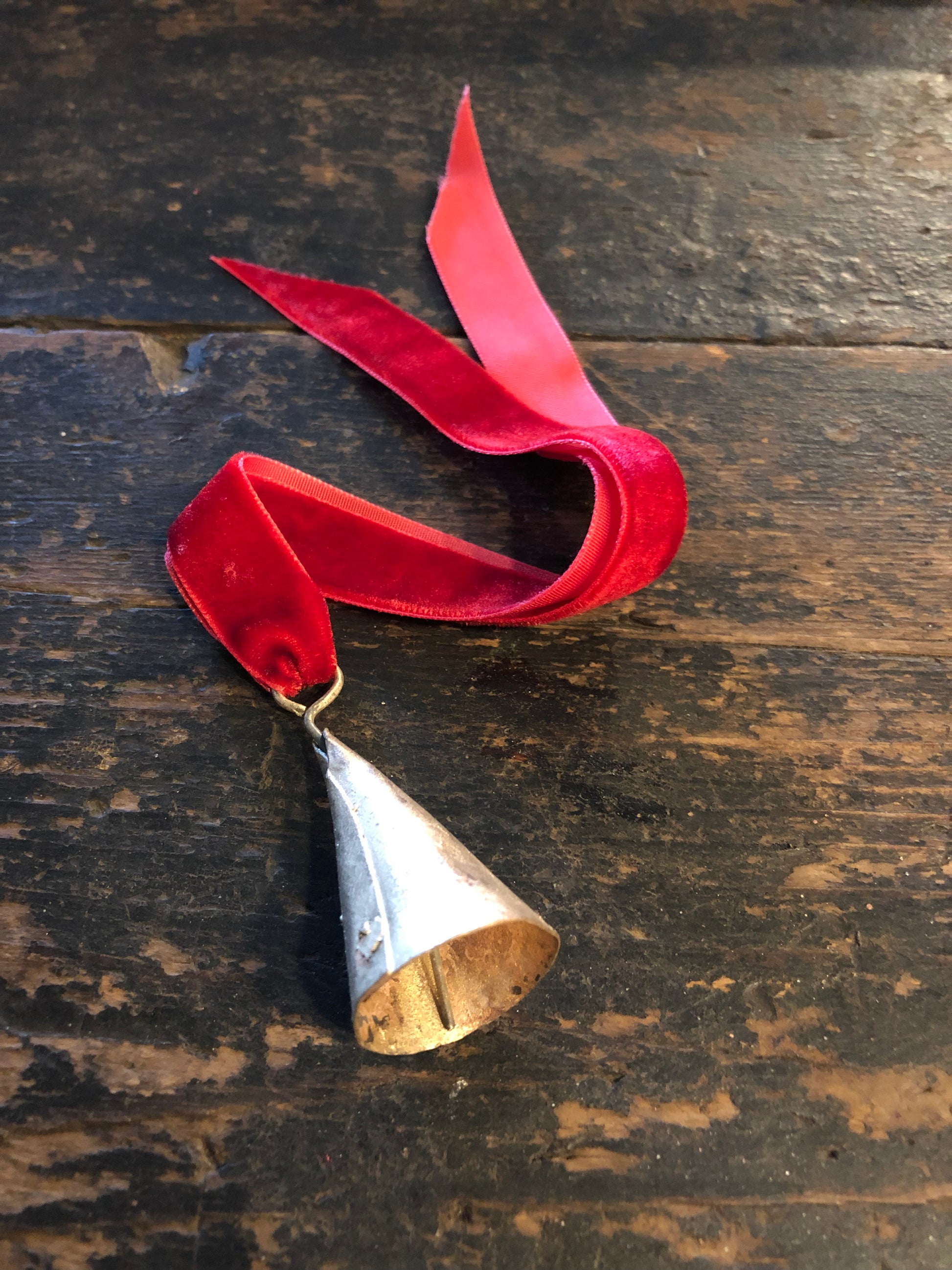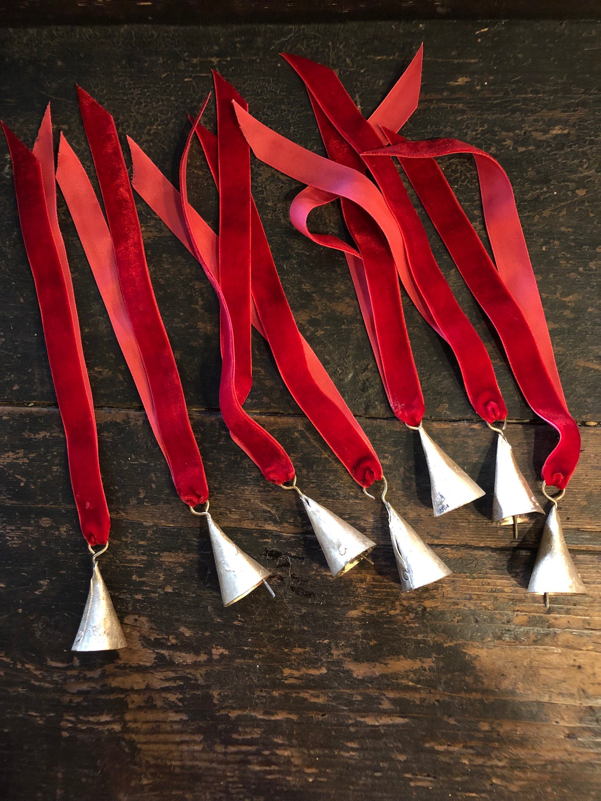 Cow Bells, handmade in india finished with a red ribbon to hang.