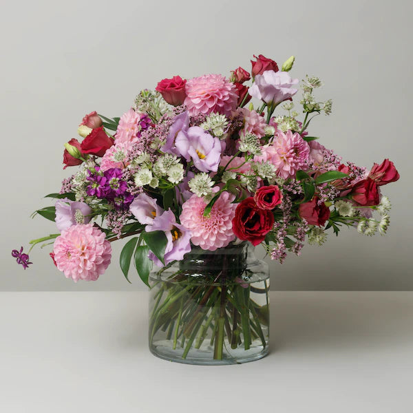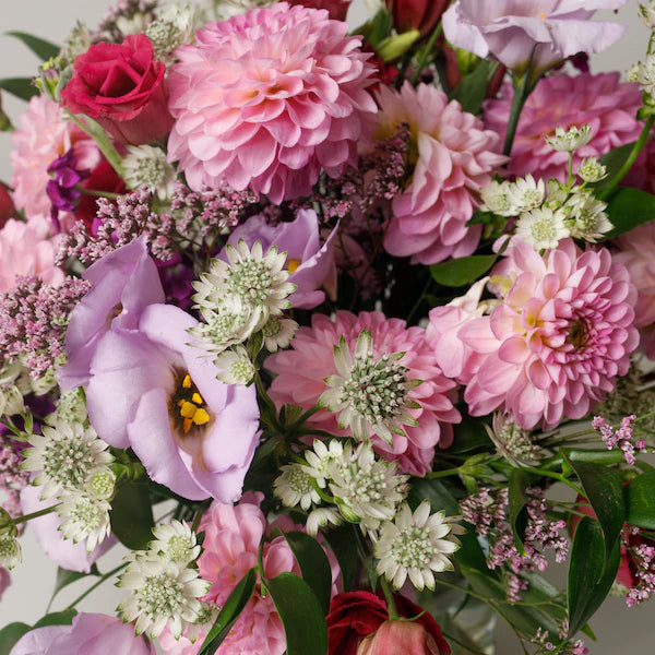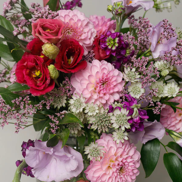 Celebrating late Summer / early Autumn with our juiciest bouquet – featuring bright red, pink and deep purple limoniums, dahlias and lisianthus bursting with colour.