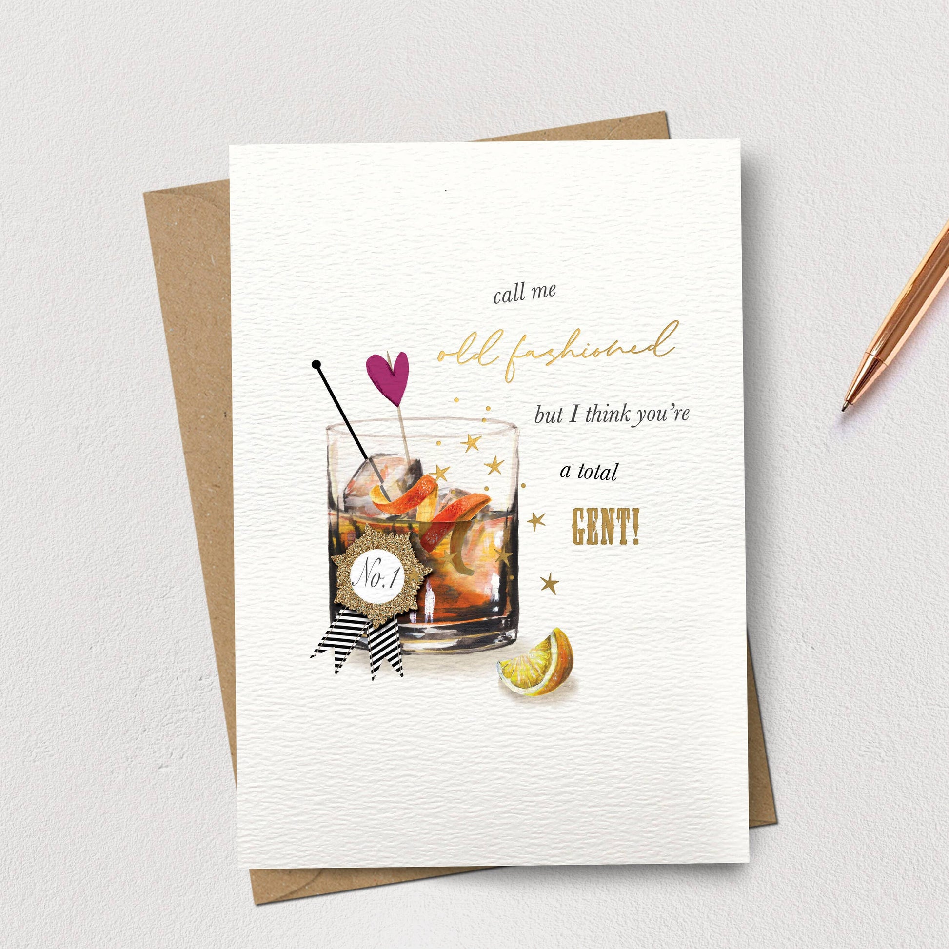 This greetings card features an illustrated old-fashioned whiskey drink and is hot foil stamped by hand. Perfect to send to a total gent on their birthday or Valentine’s day. All cards are professionally printed to the highest standards on 300gsm luxury cardstock from sustainable sources. Complete with a recycled kraft envelope and cello wrapping.