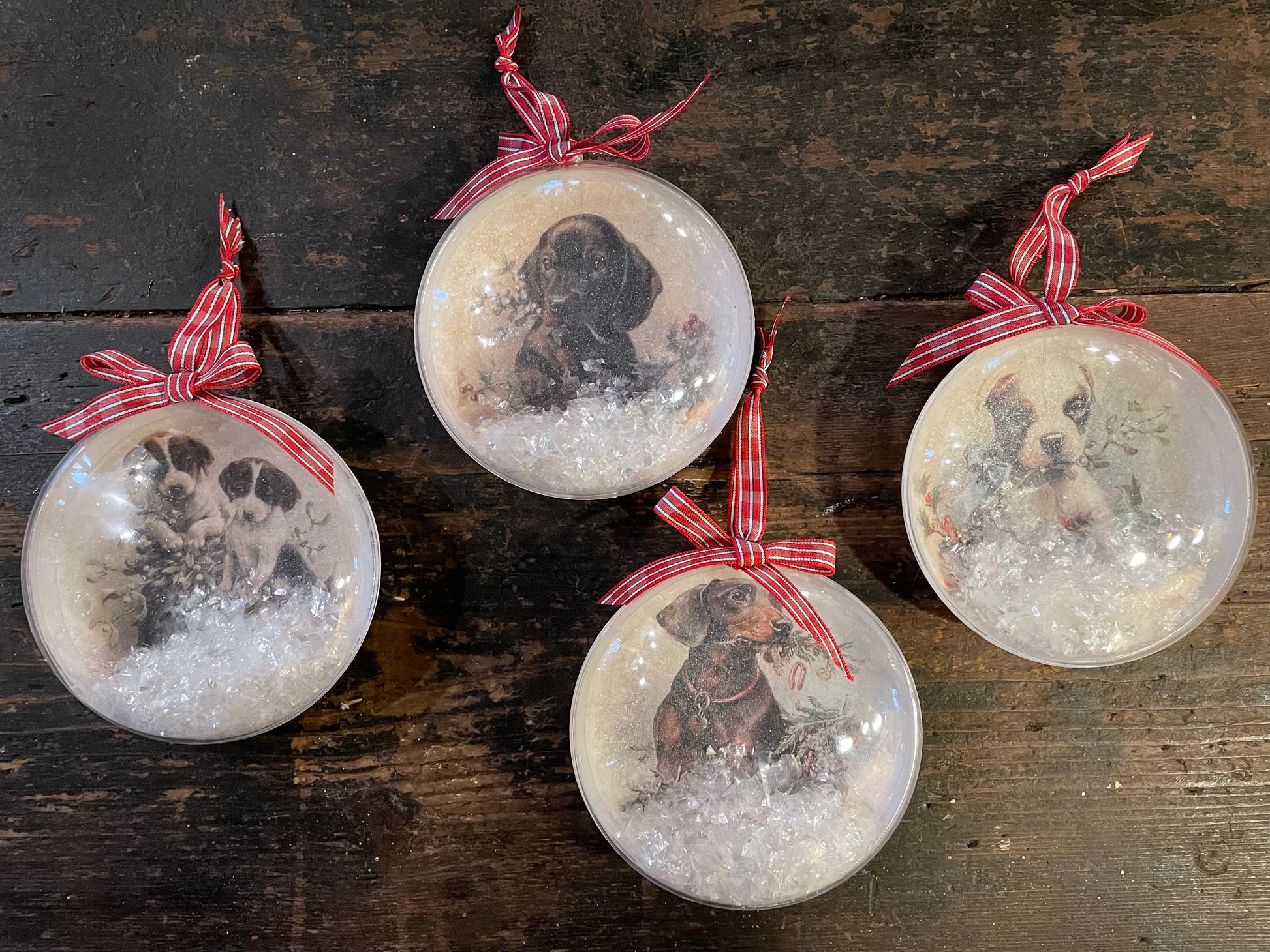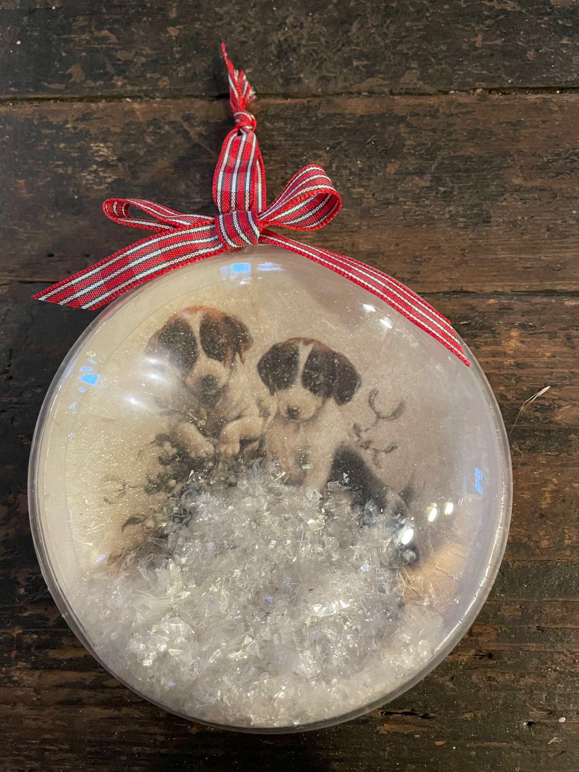 Your pup will love it too, with its clear front filled with fun sparkle and a cute vintage pup print and glazed pearlescent back with vibrant festive ribbon to hang from your tree.