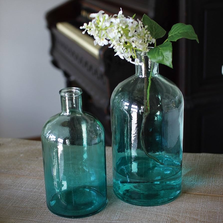 Introducing this recycled glass bottle vase, perfect for adding a touch of natural beauty to any room. Crafted from blue and clear glass, this vase not only showcases your flowers in an eco-friendly way, but also adds a lovely pop of color to your decor. Embrace nature with this botanical-inspired piece.