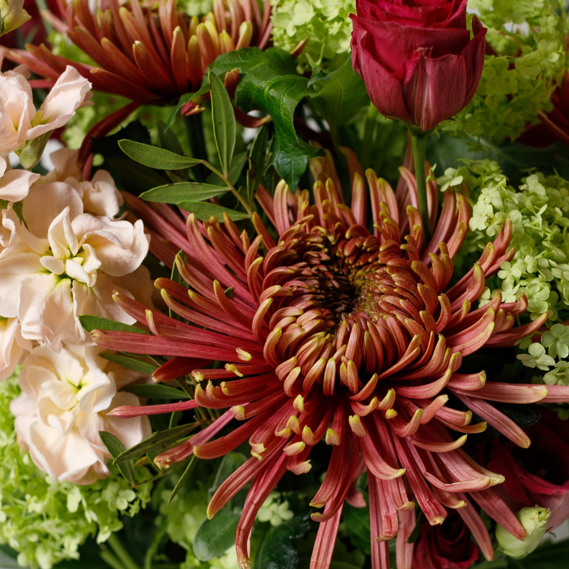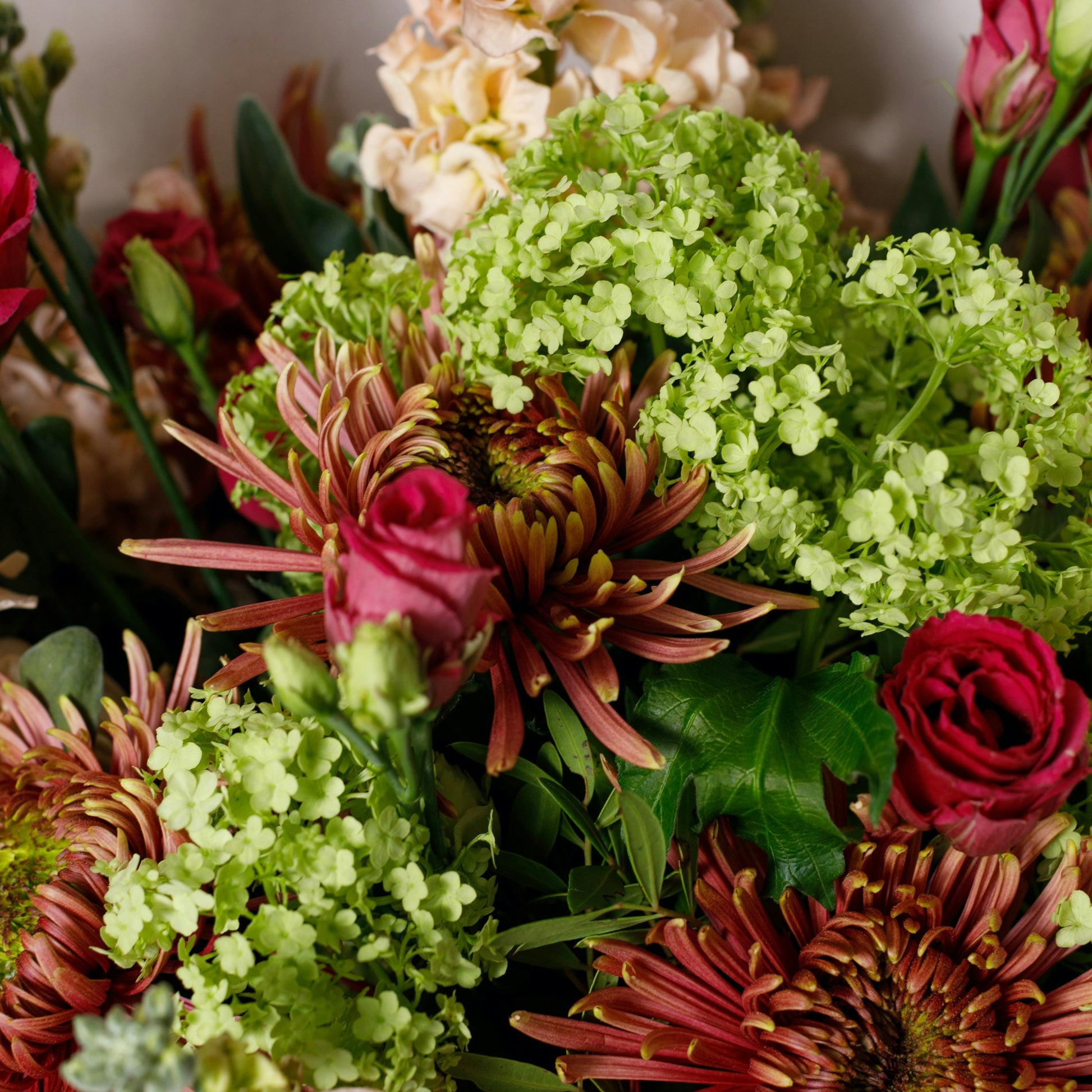 Moody colour combinations with apricots, deep reds and soft pinks playing off each other in this highly stylised bouquet.