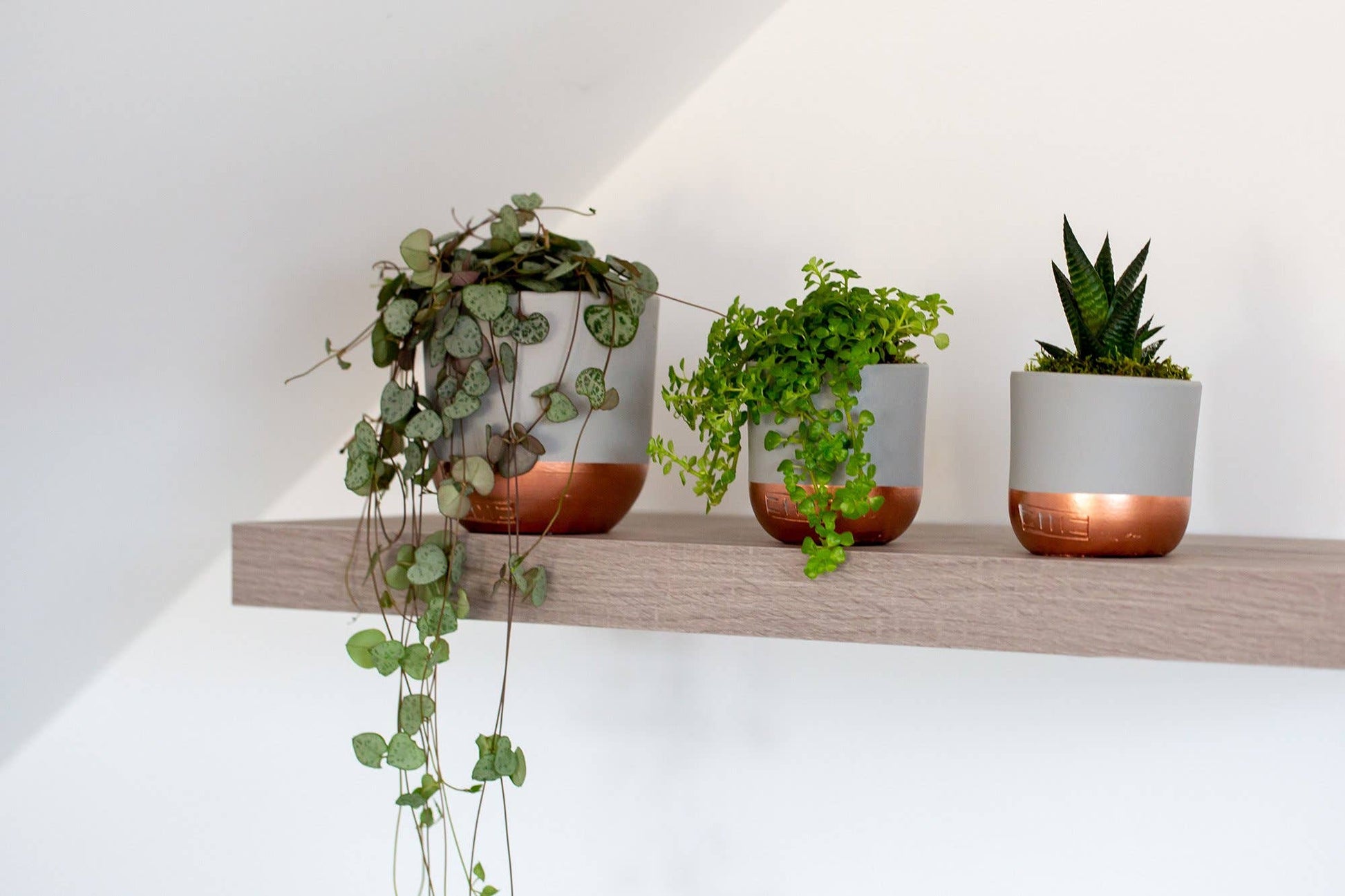 String of Hearts (Ceropegia woodii) A trailing favourite, the String of Hearts is loved for its delicate, heart-shaped leaves and elegant cascading vines. Each leaf is beautifully patterned with tones of deep green and silver, while the underside often shows off a soft purple hue – adding a touch of charm and contrast.