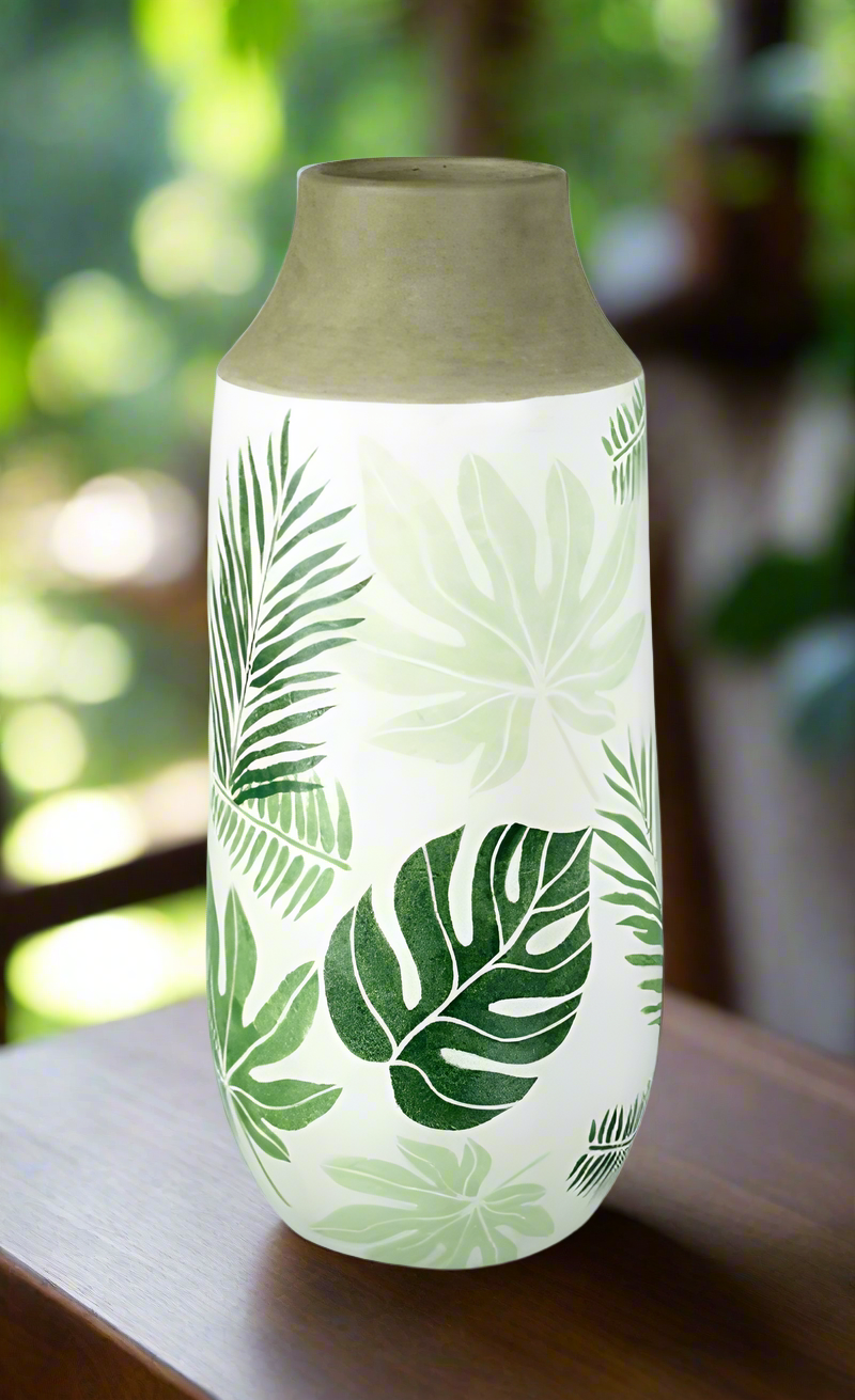 This white tropicana vase with a bold green leaf/ palm print certainly won't disappoint! available in two sizes.