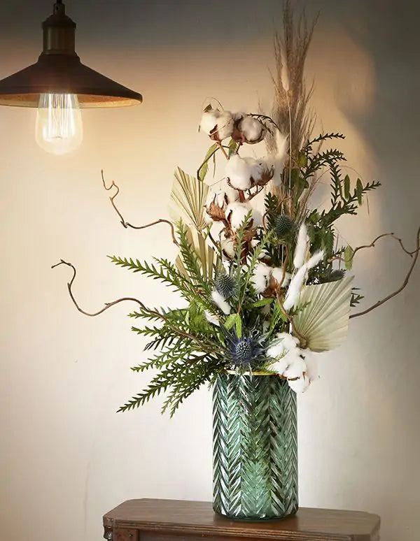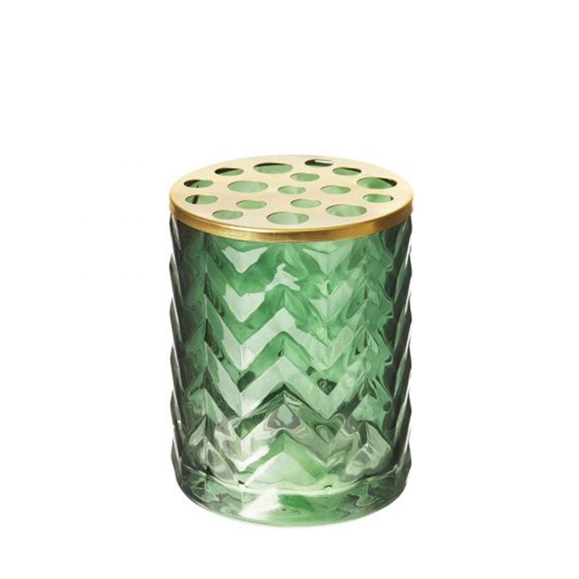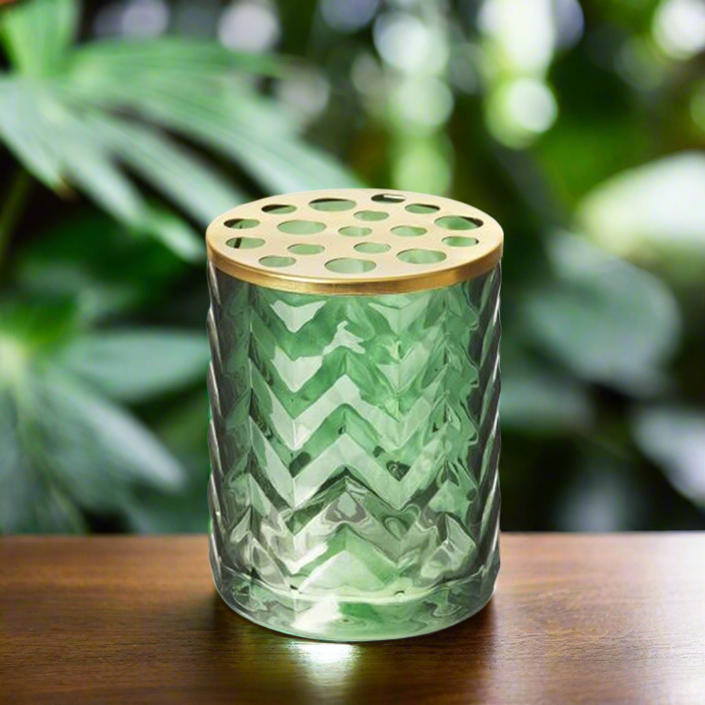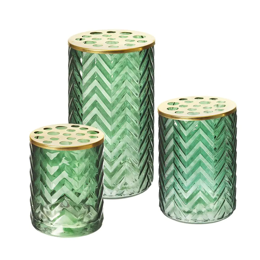 This beautiful Kendall vase features a unique green chevron glass design, paired with a delicate brass frog to securely hold your flowers in place. Add a touch of botanical elegance to your home decor with this stunning vase.